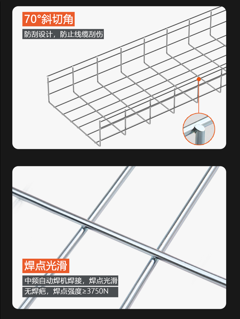 CM代表网格桥架,100x150体现高100mmx宽150mm,高宽都是指桥架内尺寸。丝径可以在3.5mm-6.0mm定制(丝径常用是5.0mm)。